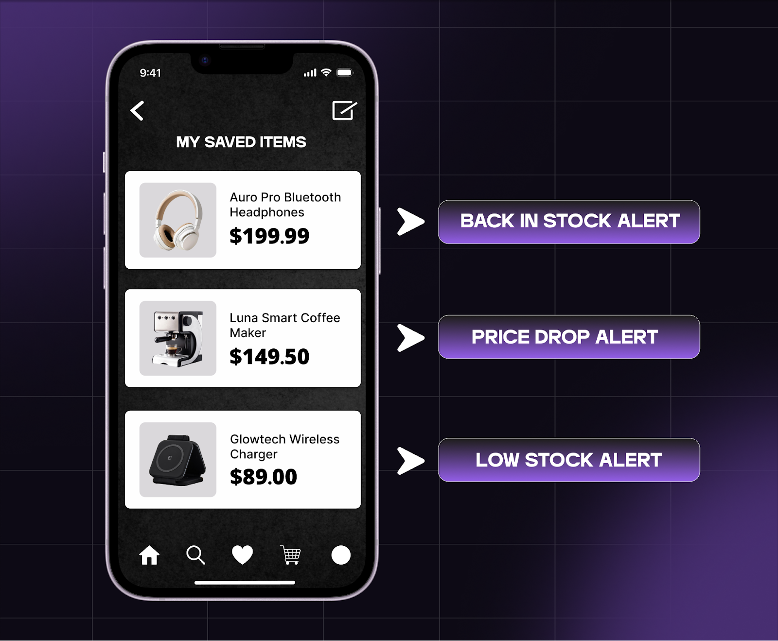Back-in-stock alerts tied to products a shopper has viewed or saved.
