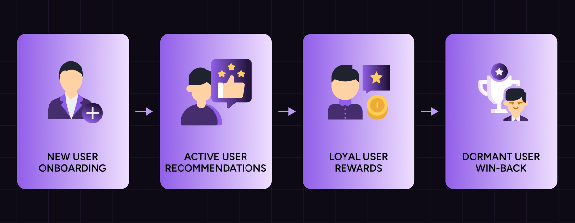 Dormant users: Win-back journeys, reminders tied to past activity, targeted incentives.