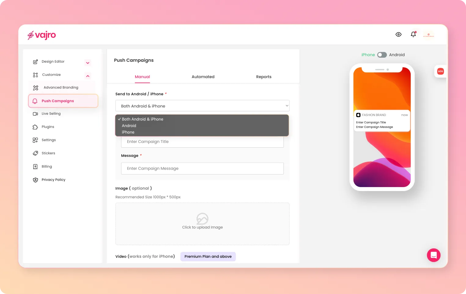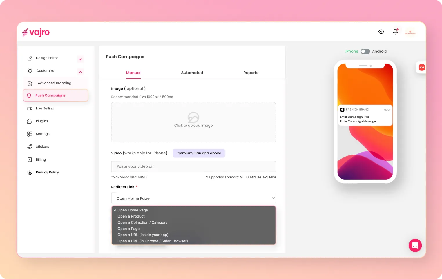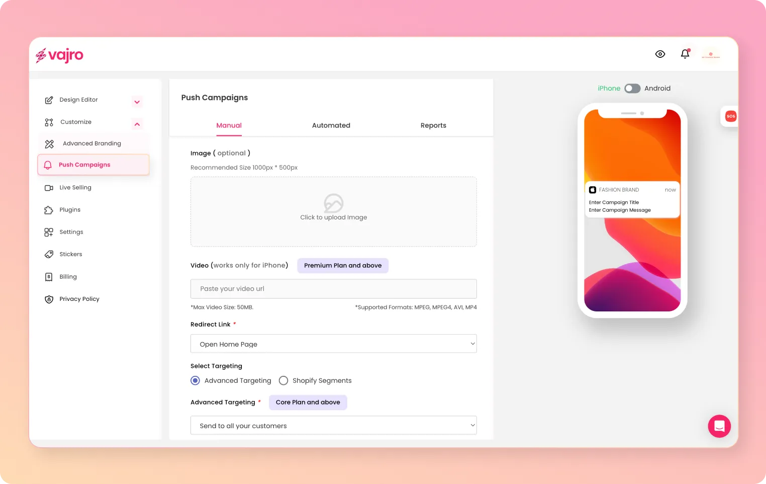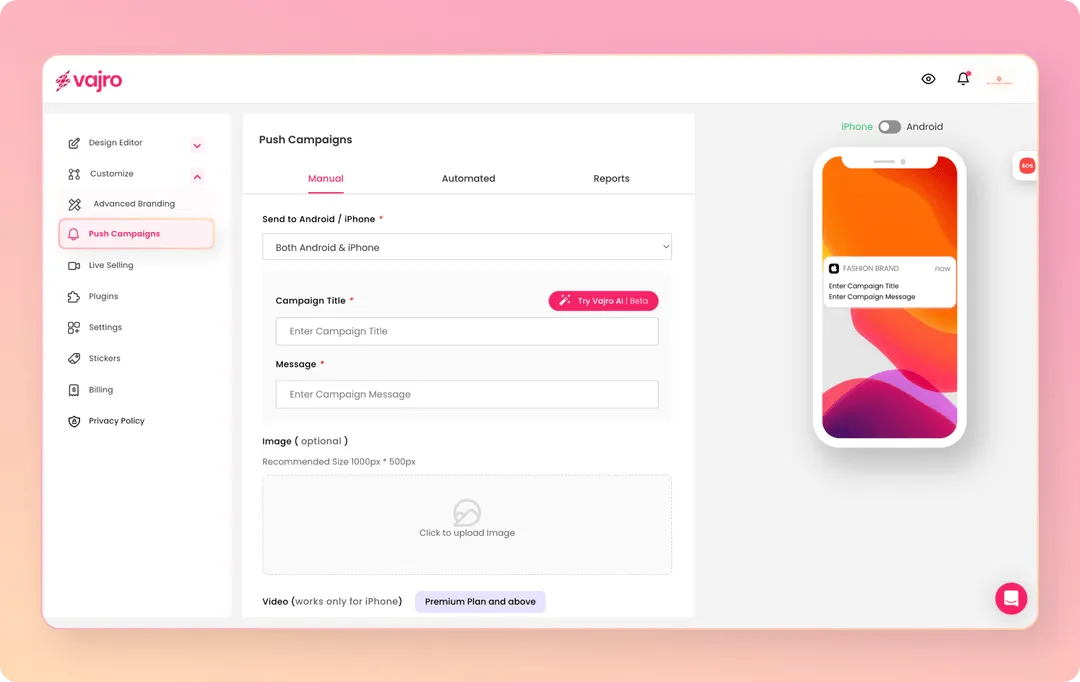 Whether you want to announce new sales, product launches, birthday discounts with GIFs, images, or videos, Vajro’s got you covered.