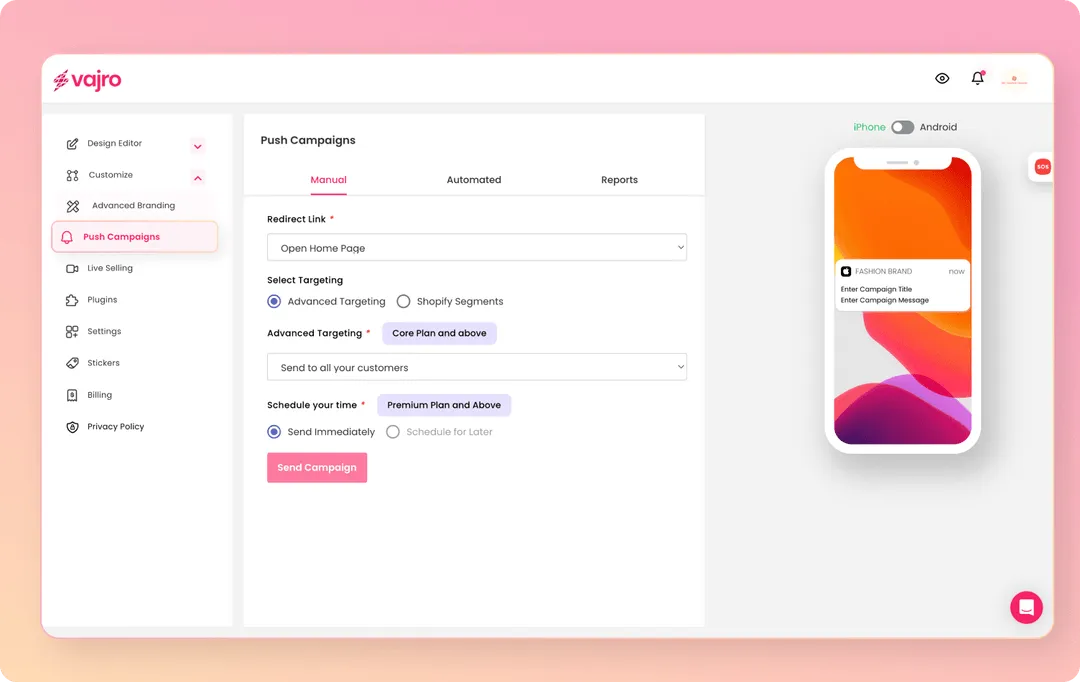 Vajro enables you to send targeted push notifications to customers, whether it’s based on their location or any segment you create on Shopify, such as your most loyal customers or those with a specific purchase behavior. This means, sending super-customized push campaigns to first-time shoppers, high-value customers, retarget high-intent visitors, etc.